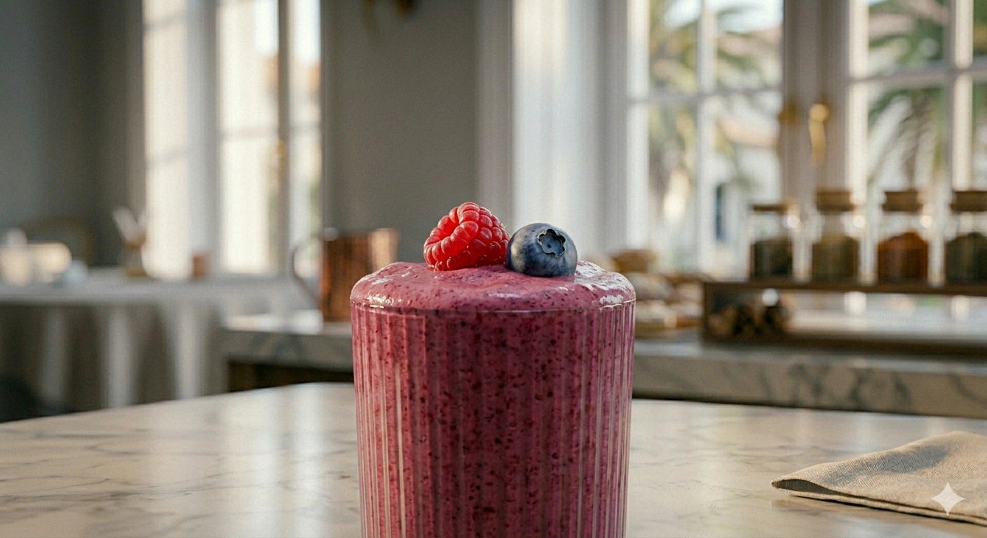 The vibrant, deep-purple hue and complex flavor profile come from a generous blend of fresh blueberries, strawberries, and raspberries. These berries are chosen for their high concentration of anthocyanins and Vitamin C, offering a naturally tart and refreshing counterpoint to the creamy protein base. Unlike standard fruit smoothies, we maintain a focus on low-glycemic index fruits to ensure a sustained energy release without the sugar crash. It is a light, zesty, and exceptionally refreshing recovery drink that tastes as bright as it looks.