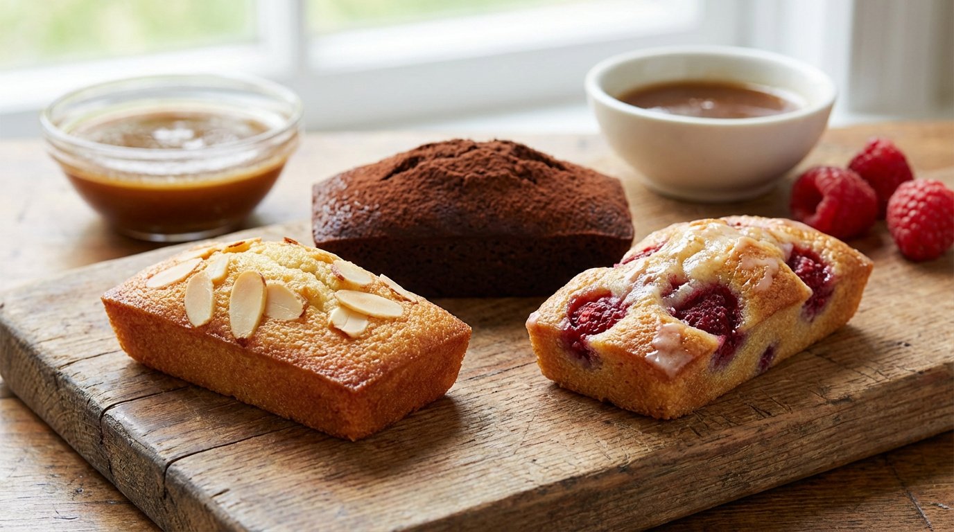 Traditional French almond tea cake with brown butter. Available in Plain, Chocolate, or Raspberry.