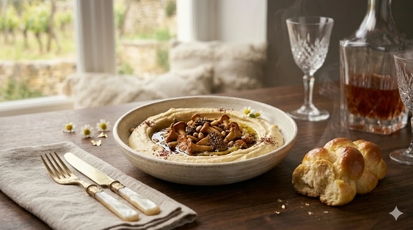 The dish is elevated with a warm topping of sautéed wild mushrooms—a blend of King Oyster and Shiitake—seared in cold-pressed olive oil with fresh thyme and cracked black pepper. To complete the experience, we serve it with a freshly baked, hand-braided Challah Bread. Our Challah is enriched with honey and extra egg yolks, providing a pillowy, slightly sweet crumb that is the ultimate vessel for scooping the warm, savory hummus.