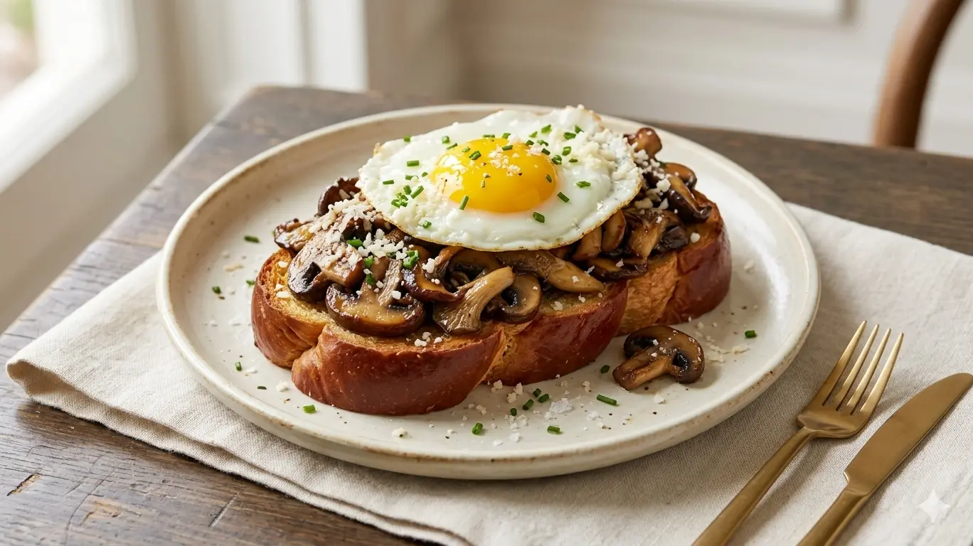 We crown this savory foundation with a decadent mound of sautéed mixed wild mushrooms—cremini, shiitake, and oyster—slow-cooked with aromatics and deglazed to enhance their natural earthiness. This savory main is crowned with a single, perfectly prepared sunny-side-up organic egg, finished with a generous dusting of rich, crumbled parmesan cheese and finely chopped fresh chives. It is a harmonious blending of comforting texture and refined flavor.