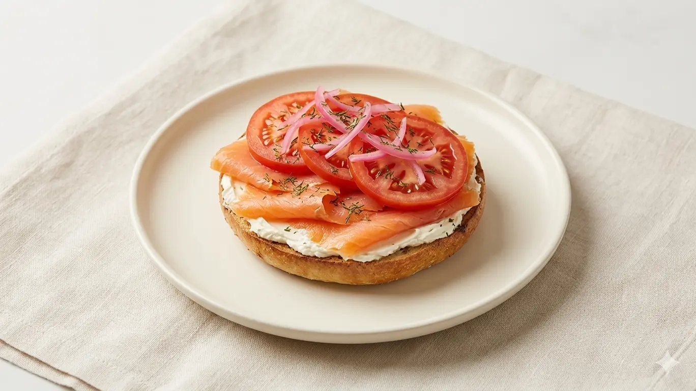 We crown this foundation with premium, cold-smoked Atlantic salmon, known for its buttery texture and delicate oak-smoked finish. To cut through the richness, we add hand-picked vine-ripened tomatoes and our house-made pickled red onions, providing a bright, tangy crunch that awakens the palate.